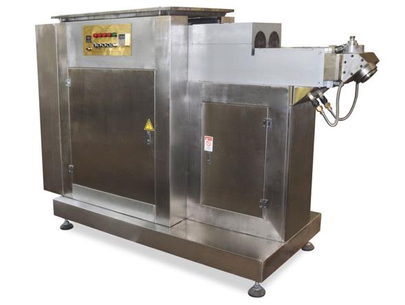 该设备用于挤压口香糖,料斗是不锈钢做的,挤出机里的挤出头采用高硬度钢,并涂有聚四氟乙烯涂层。挤出头通过热水循环保温,可以确保胶基的温度和柔软性,保证容易挤出且不会出现裂纹。